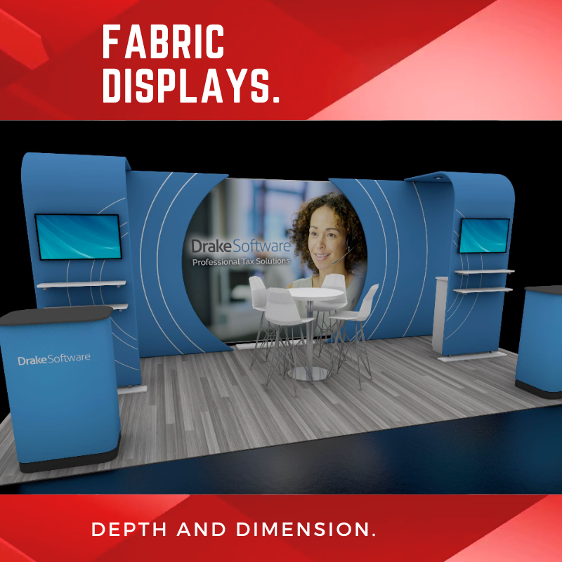Lightweight tubular frames with pillowcase graphics create smooth, seamless visuals. They are portable, tool-free, and ideal for 10x10 or 10x20 spaces needing a layered design.